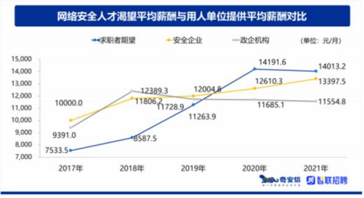 政企机构提供的网络安全相关岗位的平均薪酬约为